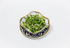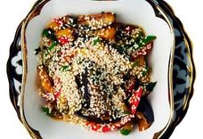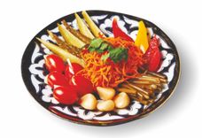 150 г • Теплый салат из запеченных баклажанов, сладкого перца, огурца и чеснока. Салат заправляется соевым соусом, посыпается ароматной зеленью и кунжутом.