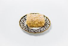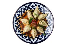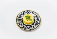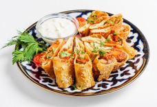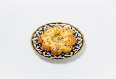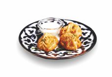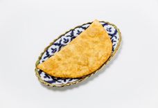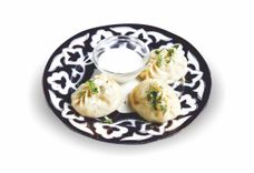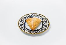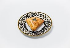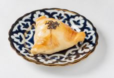 110 г • Бухарская самса из тонкого теста с начинкой из мелкорубленной баранины и телятины с луком и тыквой.