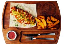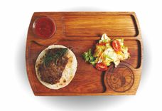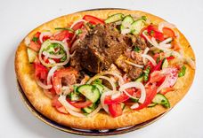 730 г • Сочная обжаренная телятина с овощным салатом Шакароп на домашней лепешке в йогуртном соусе.