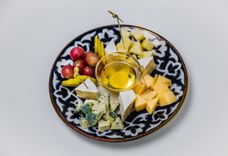 320 г • Нарезка из деликатесных сыров: Бри, Дор Блю, Сулугуни, Эмменталь. Подается с медом, грушей и виноградом.