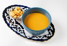 350 г • Нежный крем-суп из тыквы запеченой с медом, моркови и лука с креветками и лососем. Посыпается тыквенными семечками и подается с сухариками.