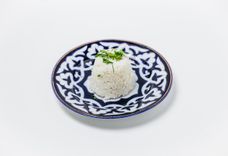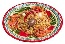 1900 г • праздничный плов, приготовленный по классическому рецепту в чугунном казане с мясом молодого курдючного барашка и рисом Лазер с добавлением желтой и красной моркови, нута, изюма и зиры, посыпается гранатом. К плову подаются казы узбекские, перепелиные яйца, салат Ачик-чучук и острый перец Чили. Плов доставляем в казанчике, который сохраняет тепло около 4 часов.