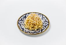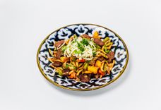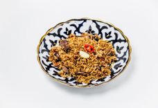 350 г • Узбекский плов готовится по старинному рецепту в чугунном казане из риса Лазер и телятины с добавлением желтой моркови, репчатого лука, барбариса, зиры, перца чили и чеснока.