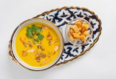 Тыквенный крем-суп с креветками и лососем