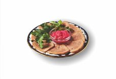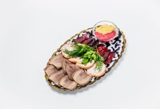 250 г • Нарезка из мясных деликатесов: нежный говяжий язык, руляда из индейки и курицы, бастурма. Подается с хреном и горчицей