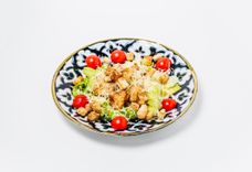 270 г • Обжаренное куриное филе, салат Айсберг, томаты черри, сыр Пармезан. Салат посыпается гренками, запряавляется фирменным соусом от шеф-повара.