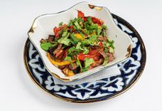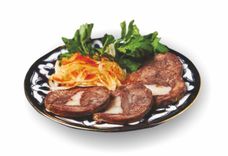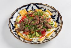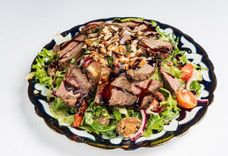 150 г • Теплый салат из нежной оюжаренной телятины, баклажанов, цукини, запеченного сладкого перца, томатов с добавлением чеснока и свежей зелени.