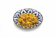 350 г • Праздничный плов, приготовленный по классическому рецепту в чугунном казане с мясом молодого курдючного барашка и рисом Лазер, с добавлением красной и желтой моркови, нута, изюма и зиры