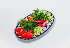 500 г • Блюдо из отборных овощей: томат, огурец, сладкий перец, молодой редис, сельдерей, острый перец и ароматная зелень. Подается с соусом Цахтоне.