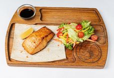 320 г • Свежий салат из спелого авокадо, сочных томатов черри, отварного яйца, листьев салата Айсберг и Лола, огурца и семги, приготовленной на гриле. Салат заправляется лимонным фрешем, посыпается льняными и тыквенными семечками