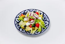 280 г • Вариация на тему классического салата: сыр Фета, томаты черри, сладкий перец, огурец, салат Айсберг, оливки, маслины, красный лук. Заправляется фирменным соусом